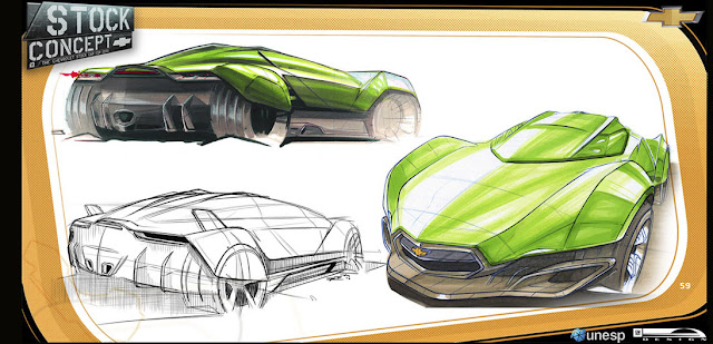 The Proposal of the project was to create a concept car for 2030, and not only a street car, but a stock Car! A huge challenge for us! I did the exterior shape designs, Bruno Said (brunosaid.blogspot.com) did the interior design, Marcelo Cardillo did the 3d surface modeling and Luis Pinheiro de Lima did the Program Management part, we formed a group of 4 people, simulating a micro studio, a micro GM, this was the very first time that a group of interns did something like this, here in GM studios in BRazil.At first, I started with some sketchs to find something to follow, to lead the conceptual part of the work, I did found a lot inspiration in the nature, looking some images of poison dart frogs, sharks, and chameleons...take a look and let me see what you think about it until now ok? see you later! TNX!